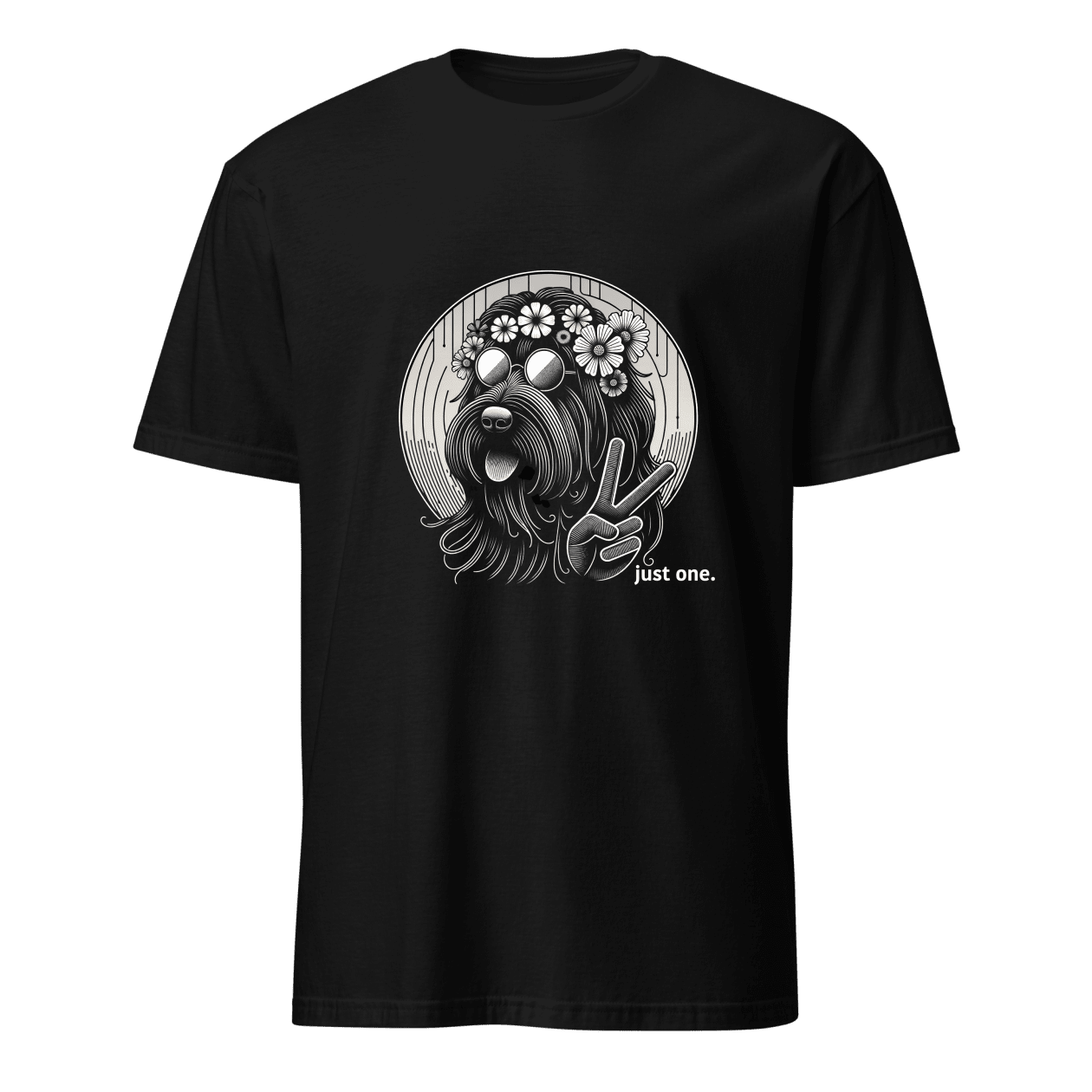 You designed it, we created it. You asked for "Shaggy black dog with flowers and peace sign looking groovy," and we delivered. Here is your one of a kind, never to be printed again t-shirt. It's just as unique as you are.